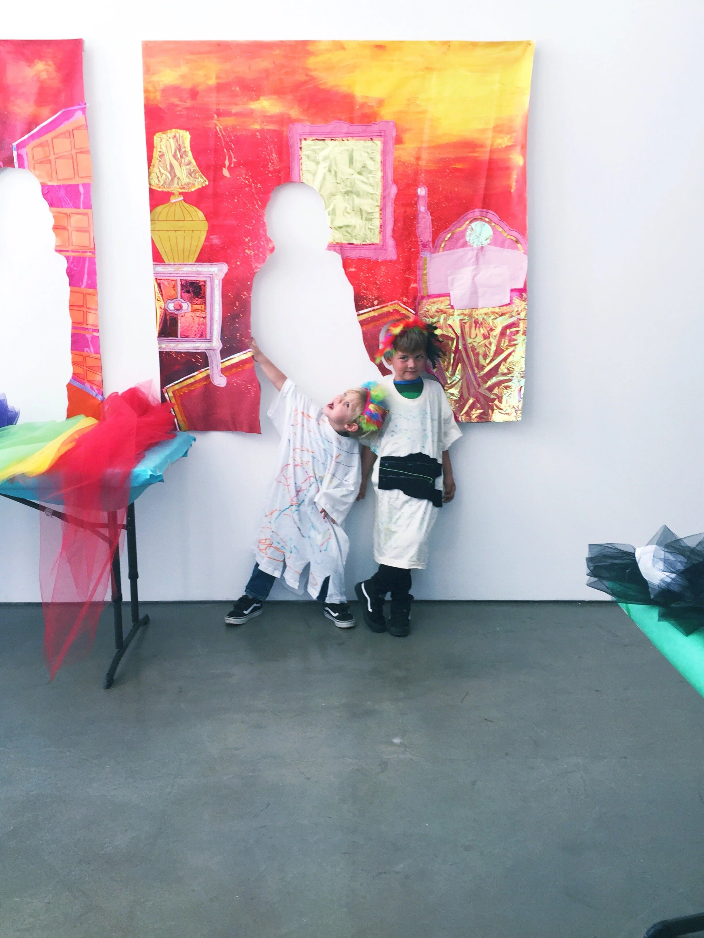 For the second portion of the afternoon, the kids spent time inventing stories and designing their own costumes and headdresses. They first thought of their stories and sketched out a plan thinking about details that would reflect their stories. Andy designed a rock and roll bass player, Otto designed rock and roll. With a T-shirt and buffet of fun materials, they got to work constructing their costumes.